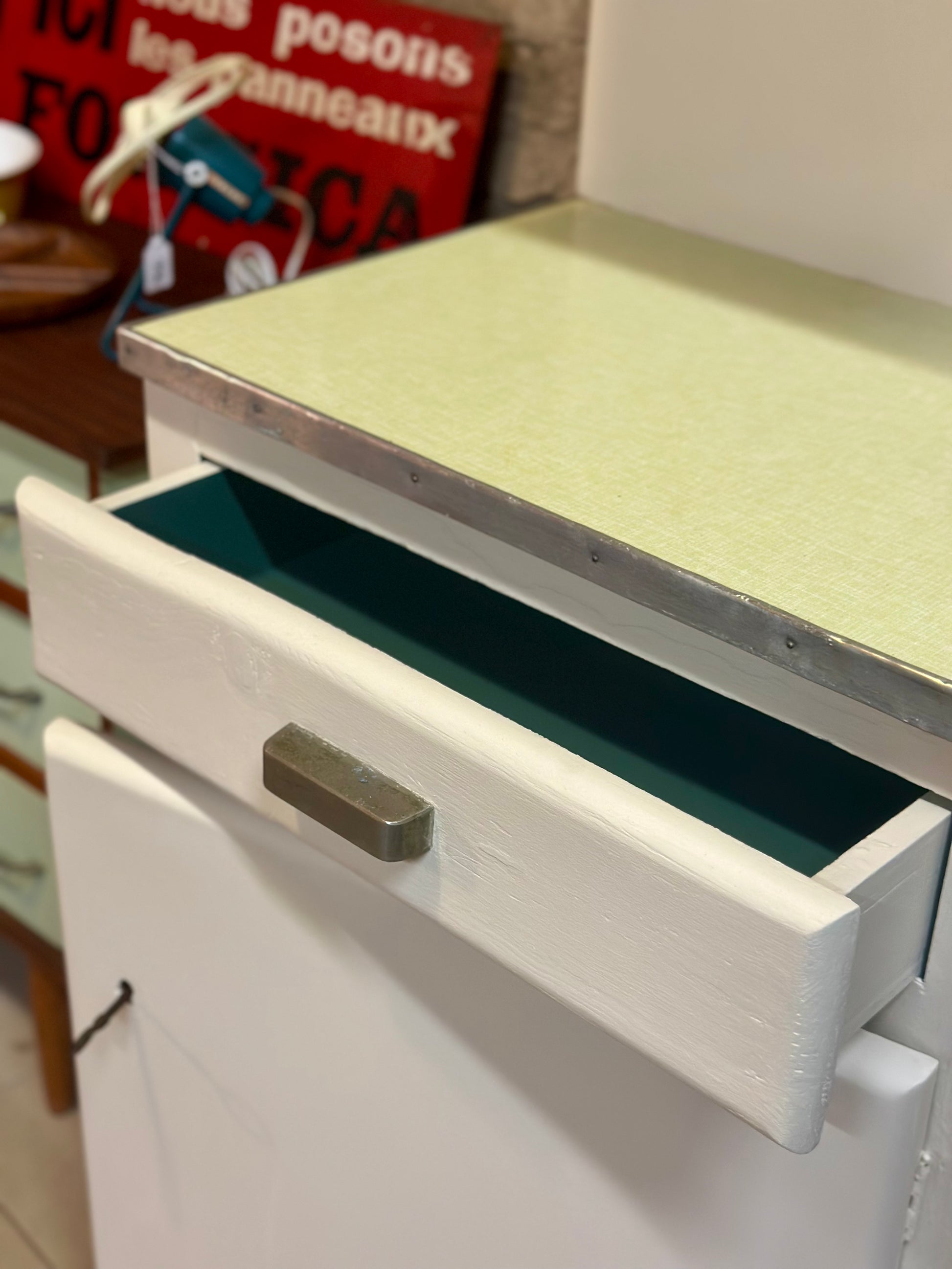 Plateau Formica vert clair et bandeau en alu en parfait état.