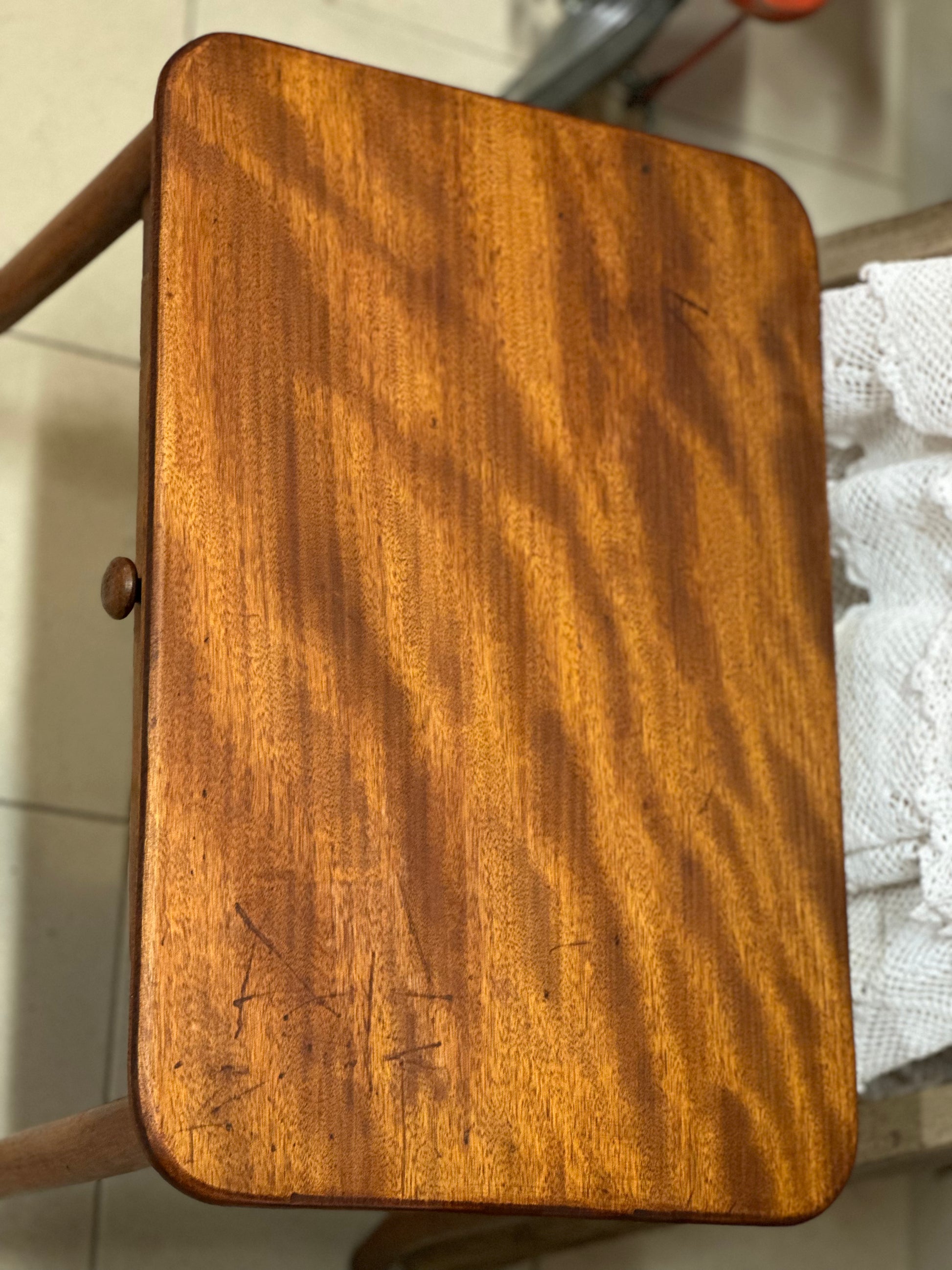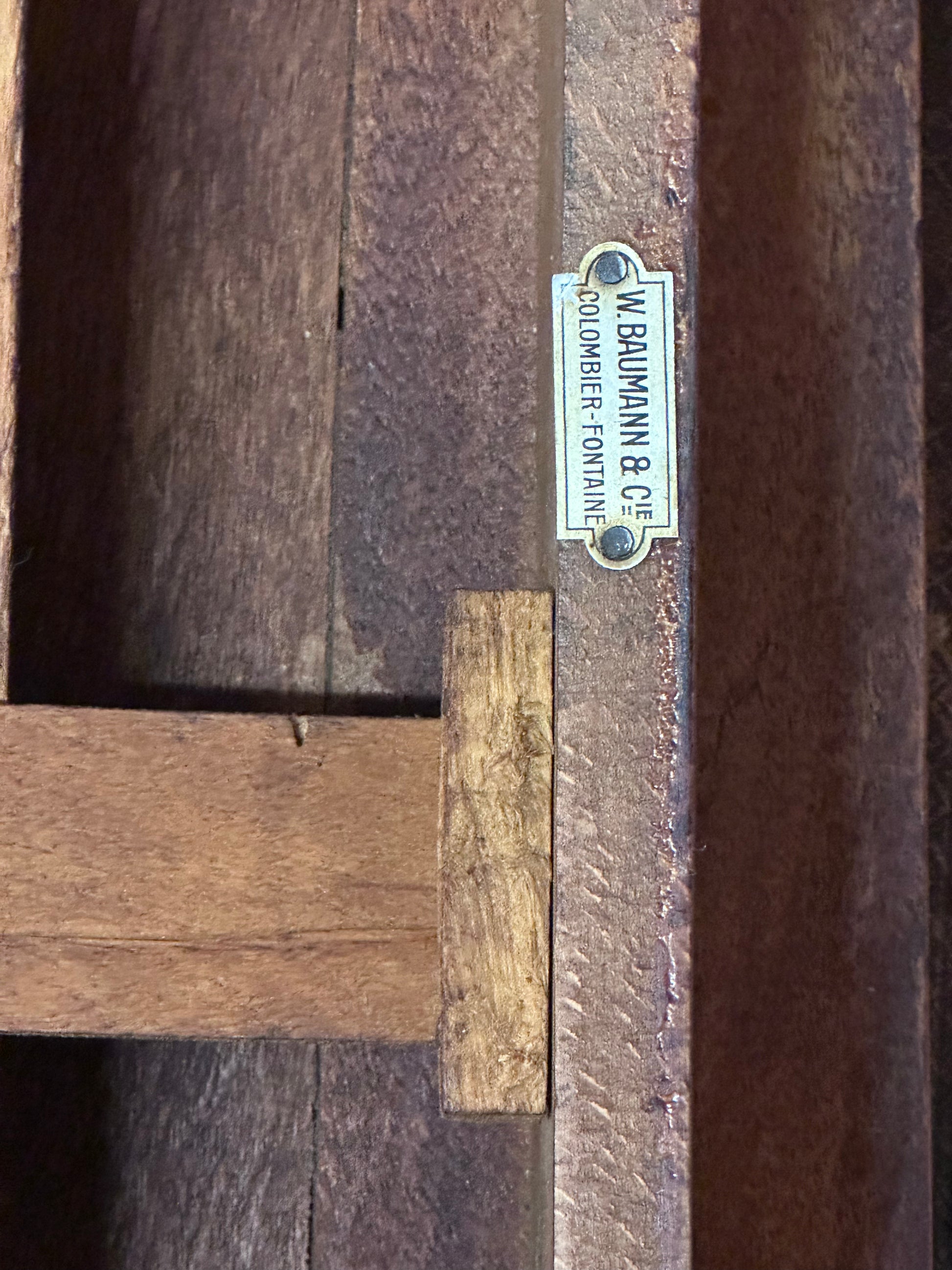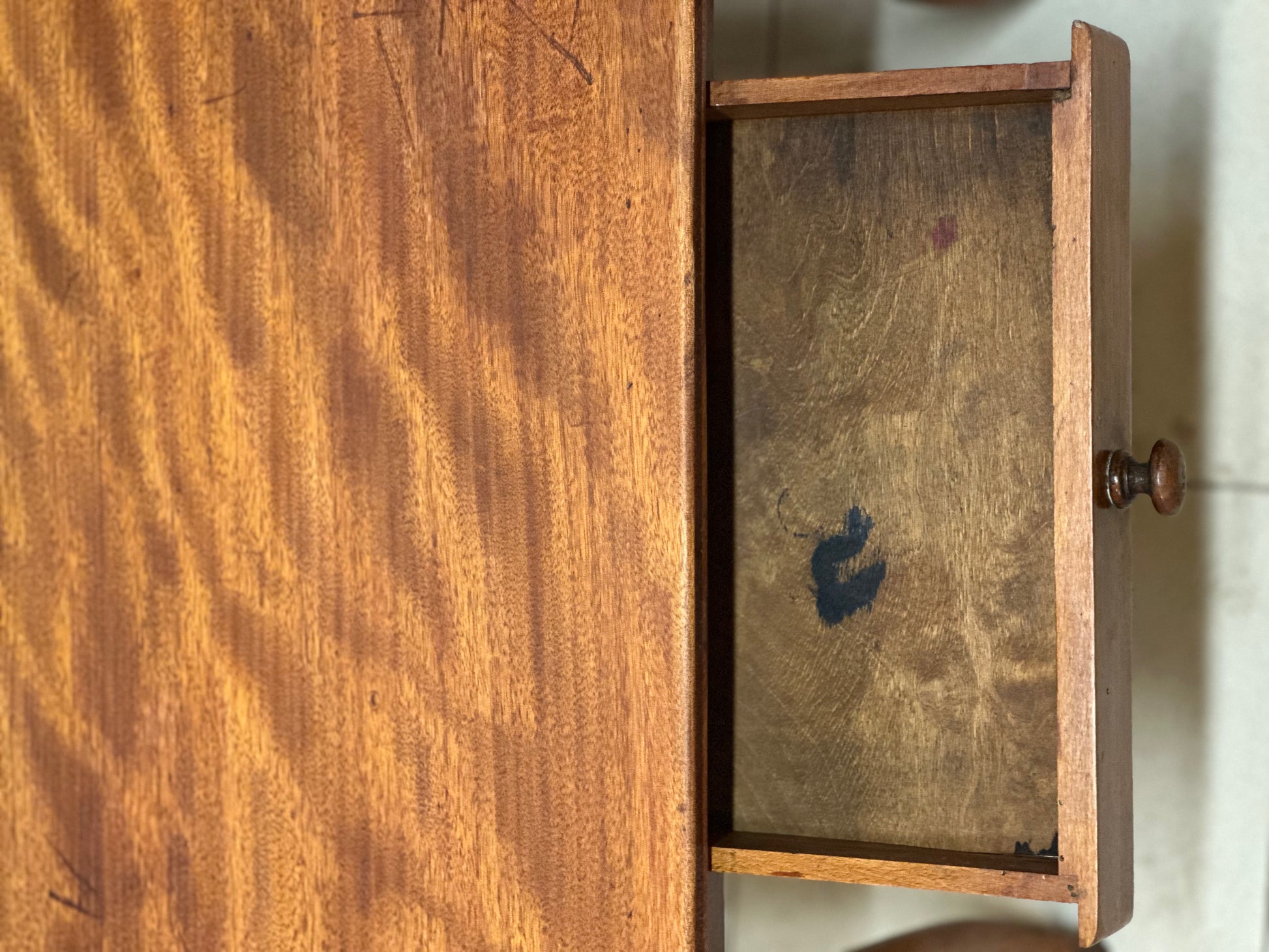 Les griffures sur le plateau sont visibles mais restaurées, la fibre du bois étant revenue à niveau. Les trous de vrillettes ont été traités un à un. De la cire d'abeilles a été apposée sur le meuble pour une protection optimale. Je vous conseillerais toutefois de ne pas exposer ce meuble ancien sous une lumière forte et directe tout au long de la journée.