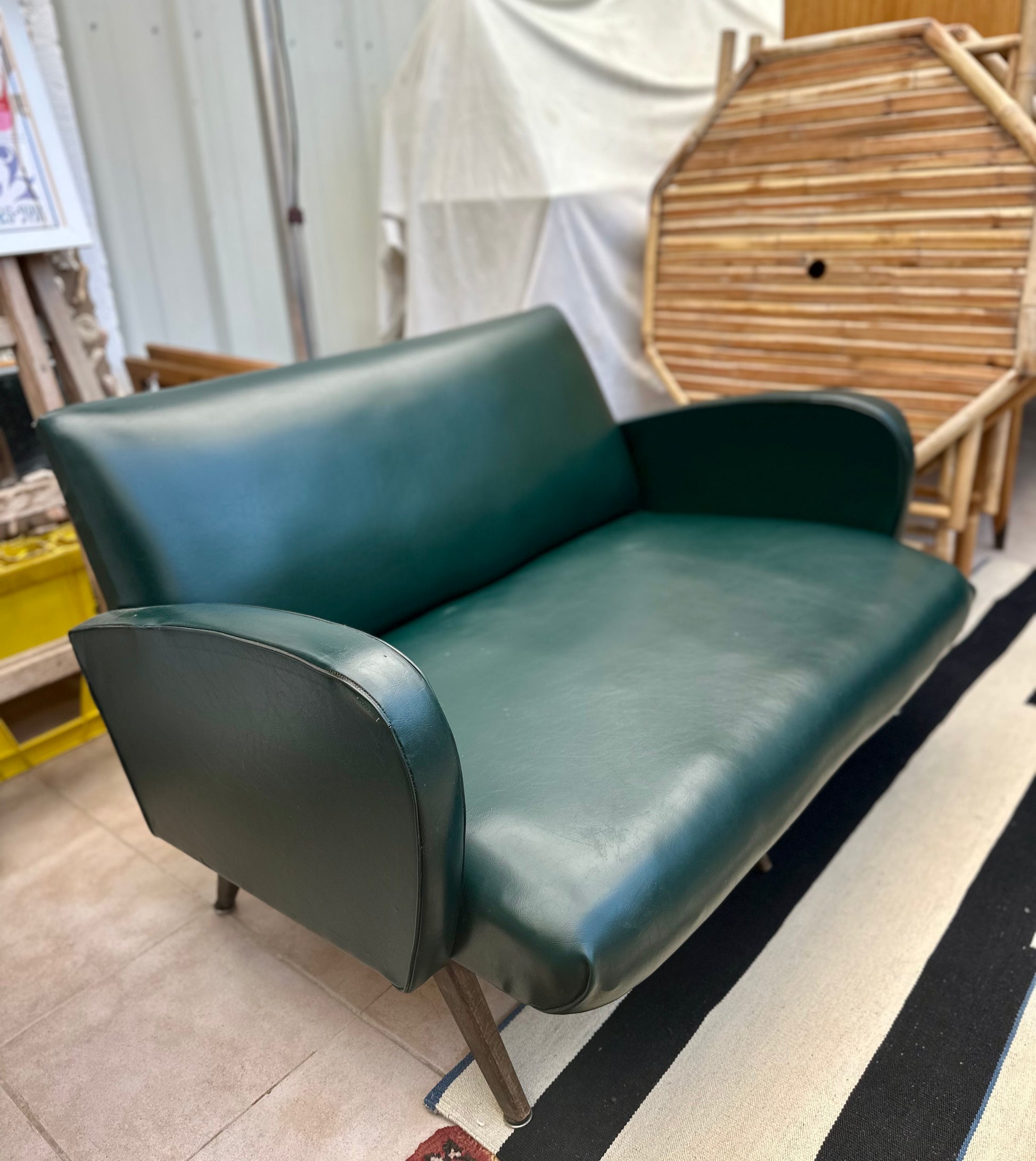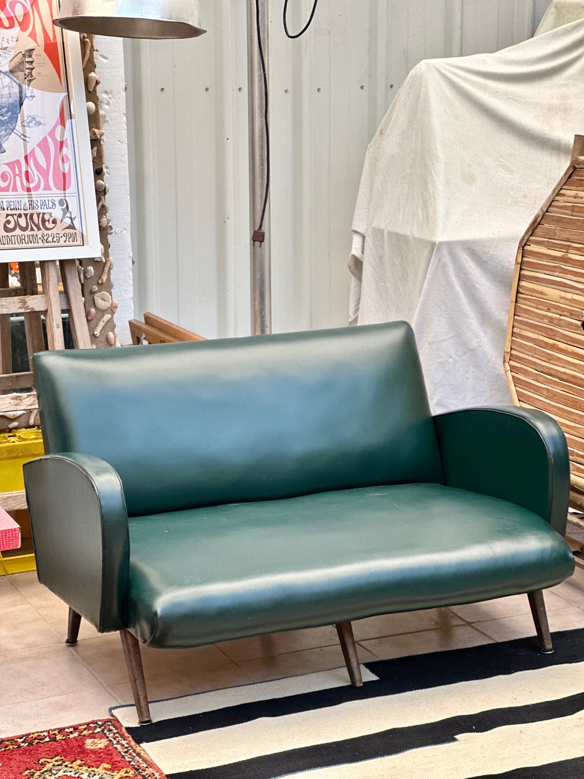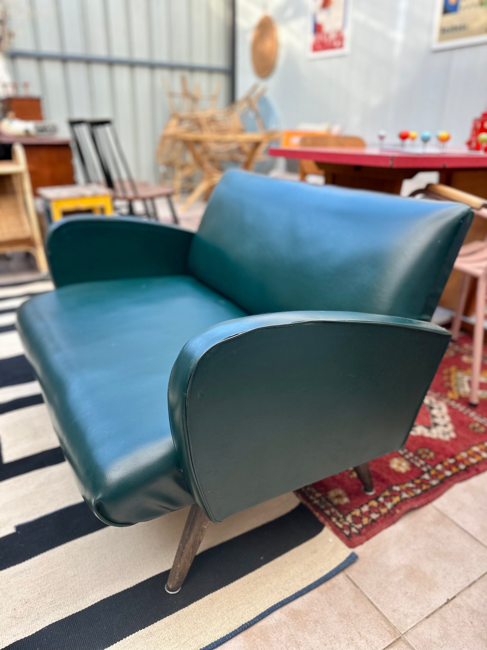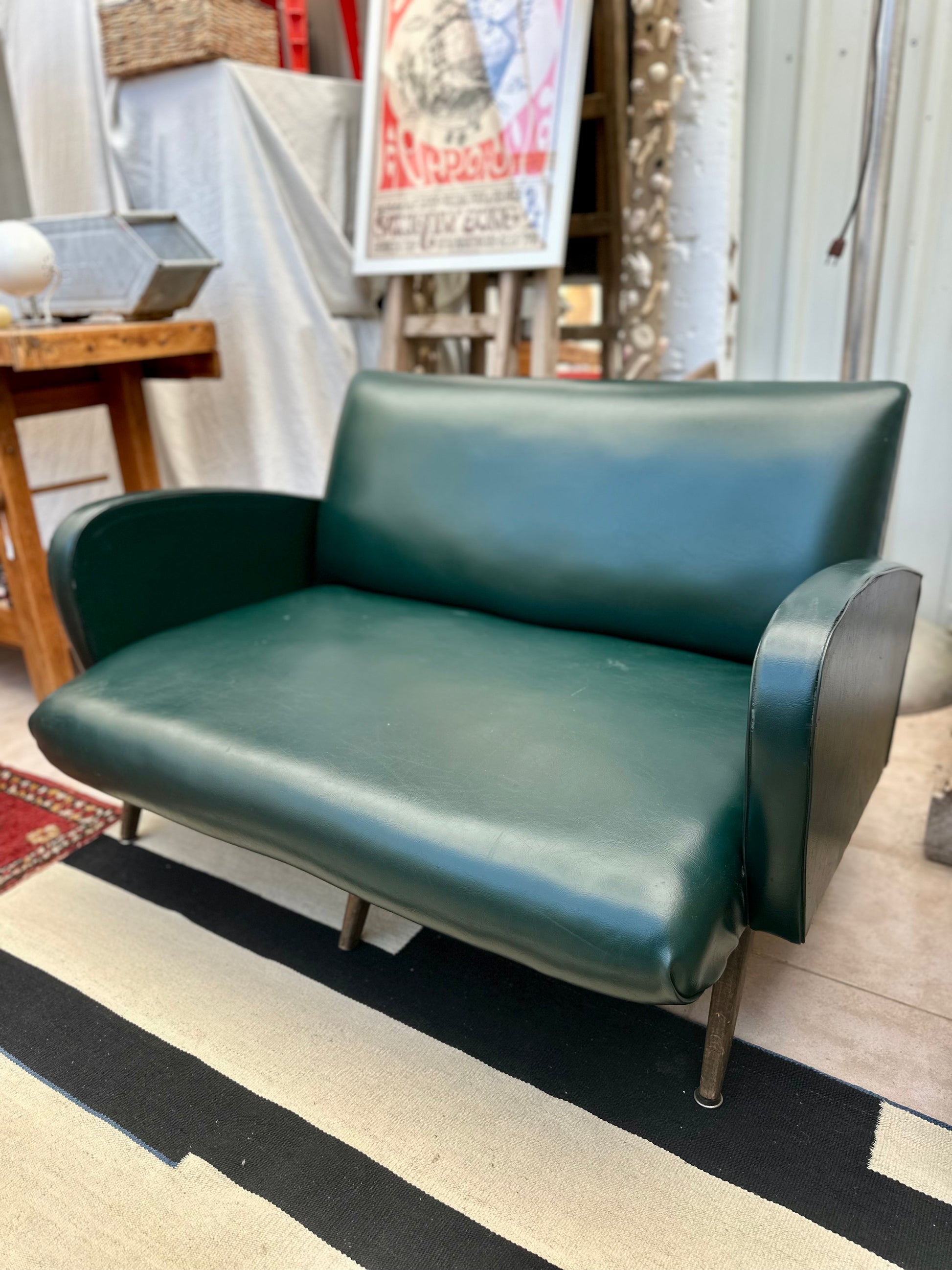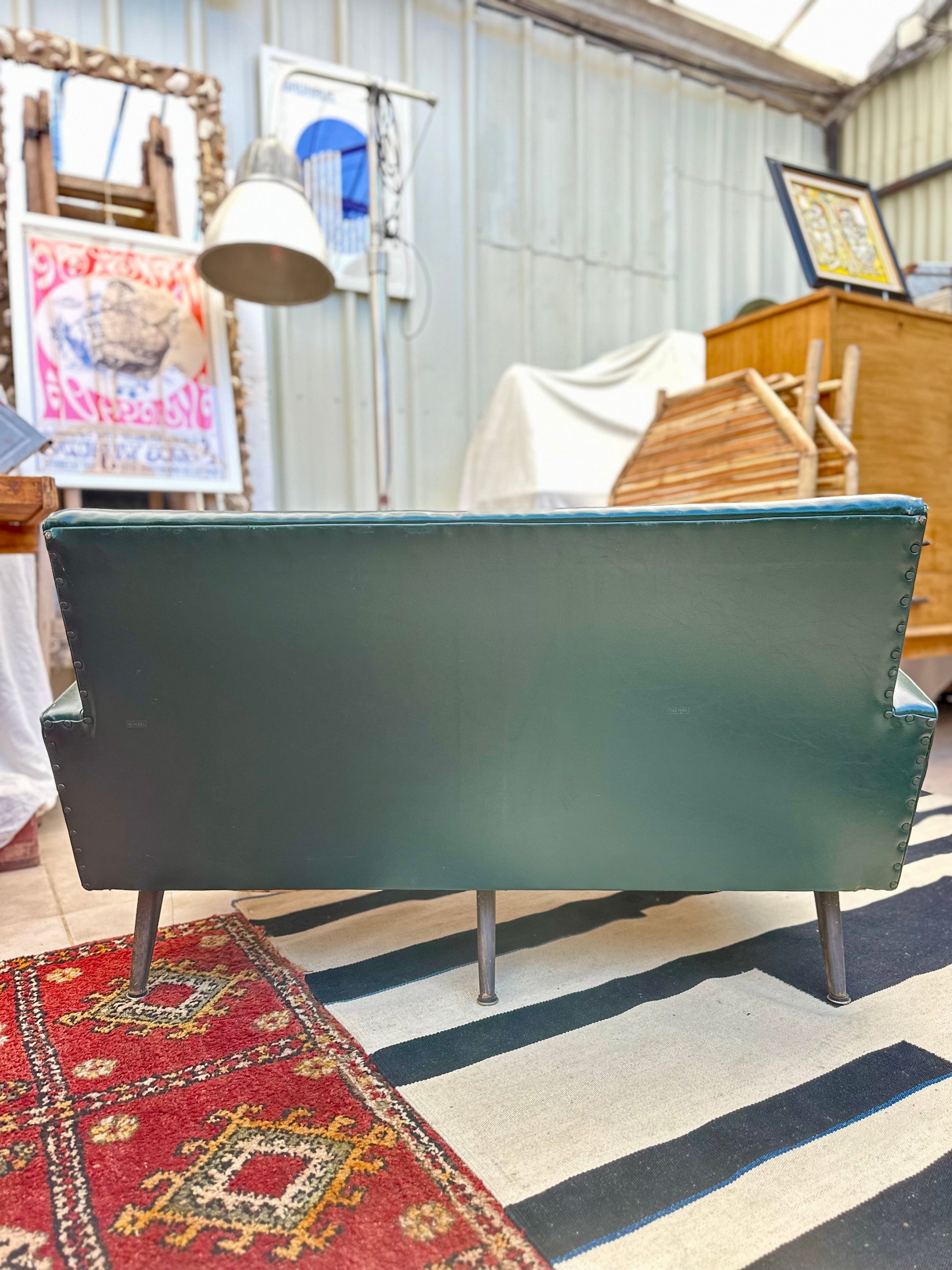 Comment ne pas tomber amoureux(se) du charme yéyé de ce canapé deux places en véritable Skaï vert bouteille des années 60 ?