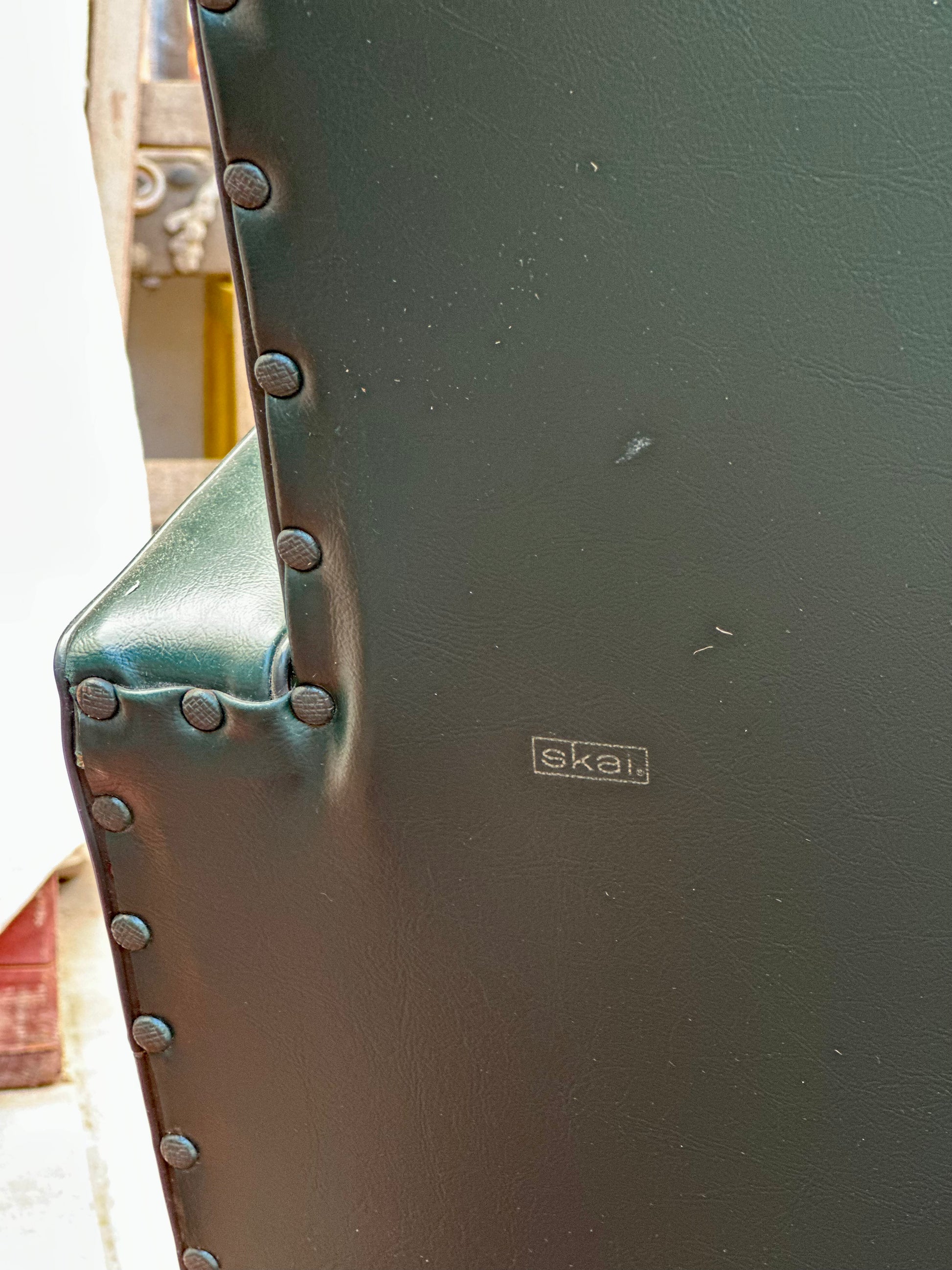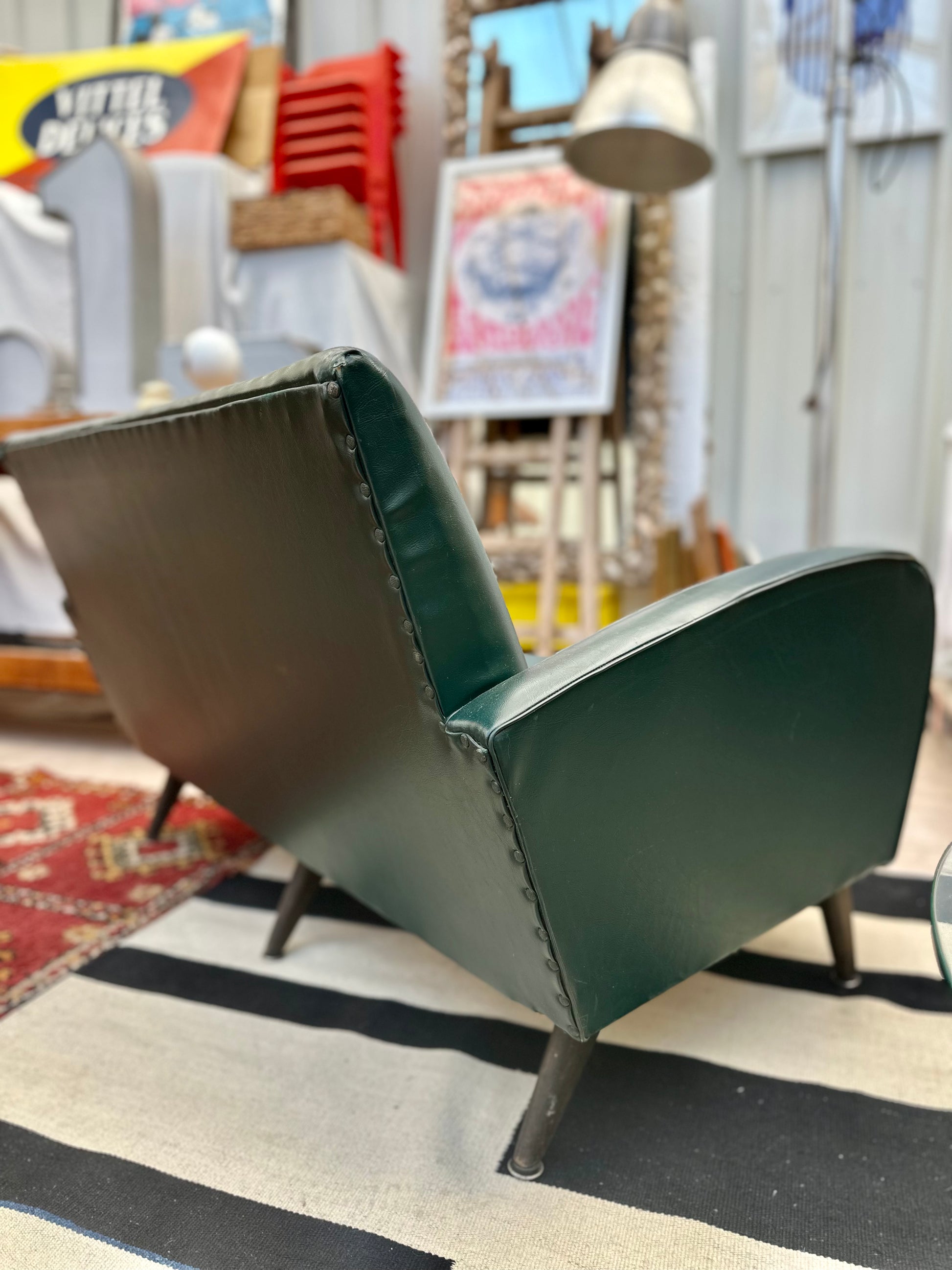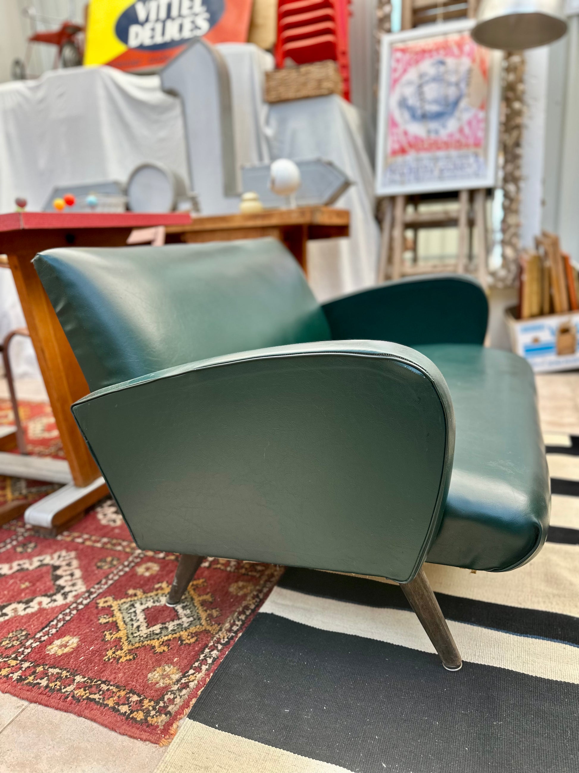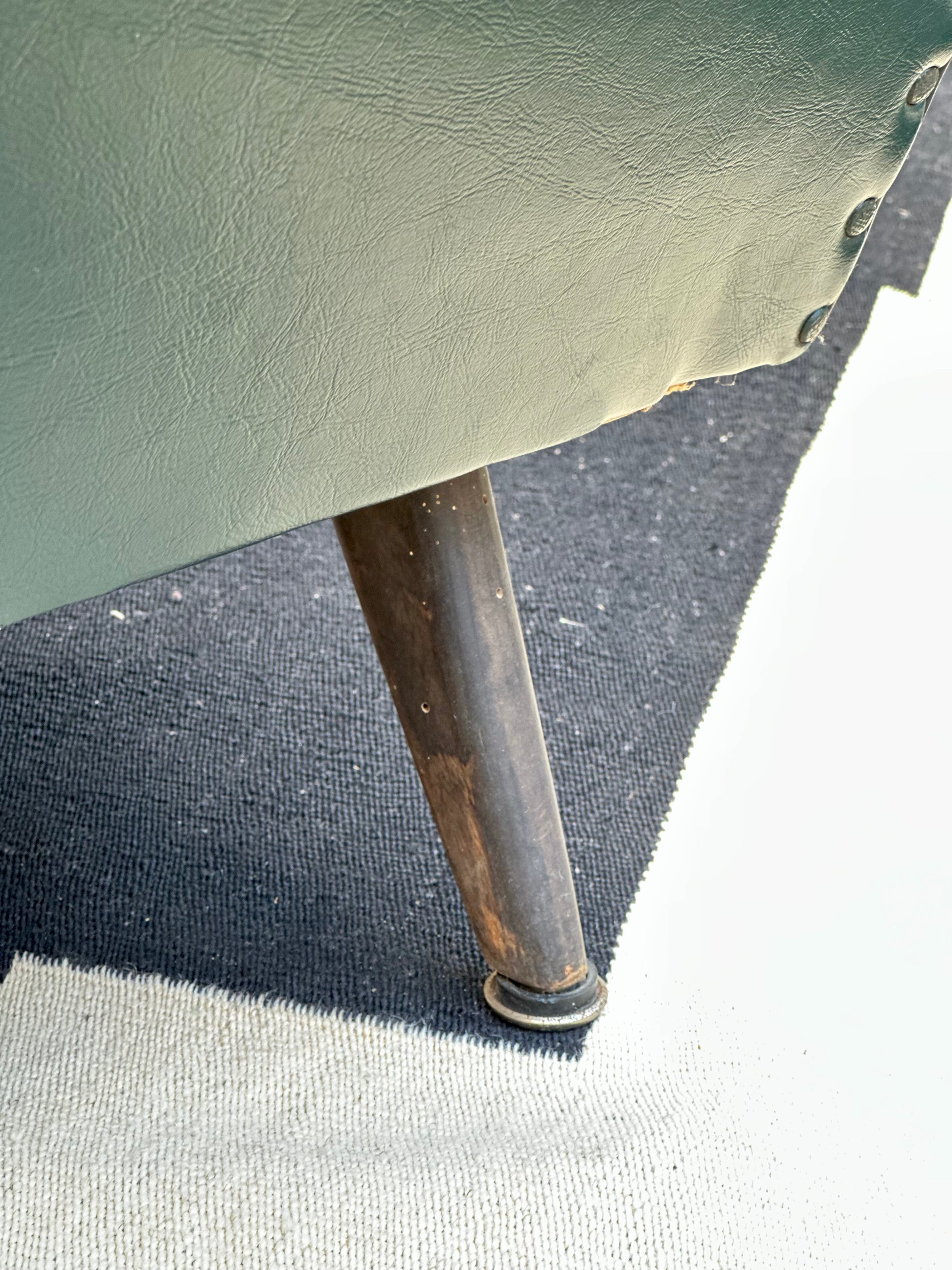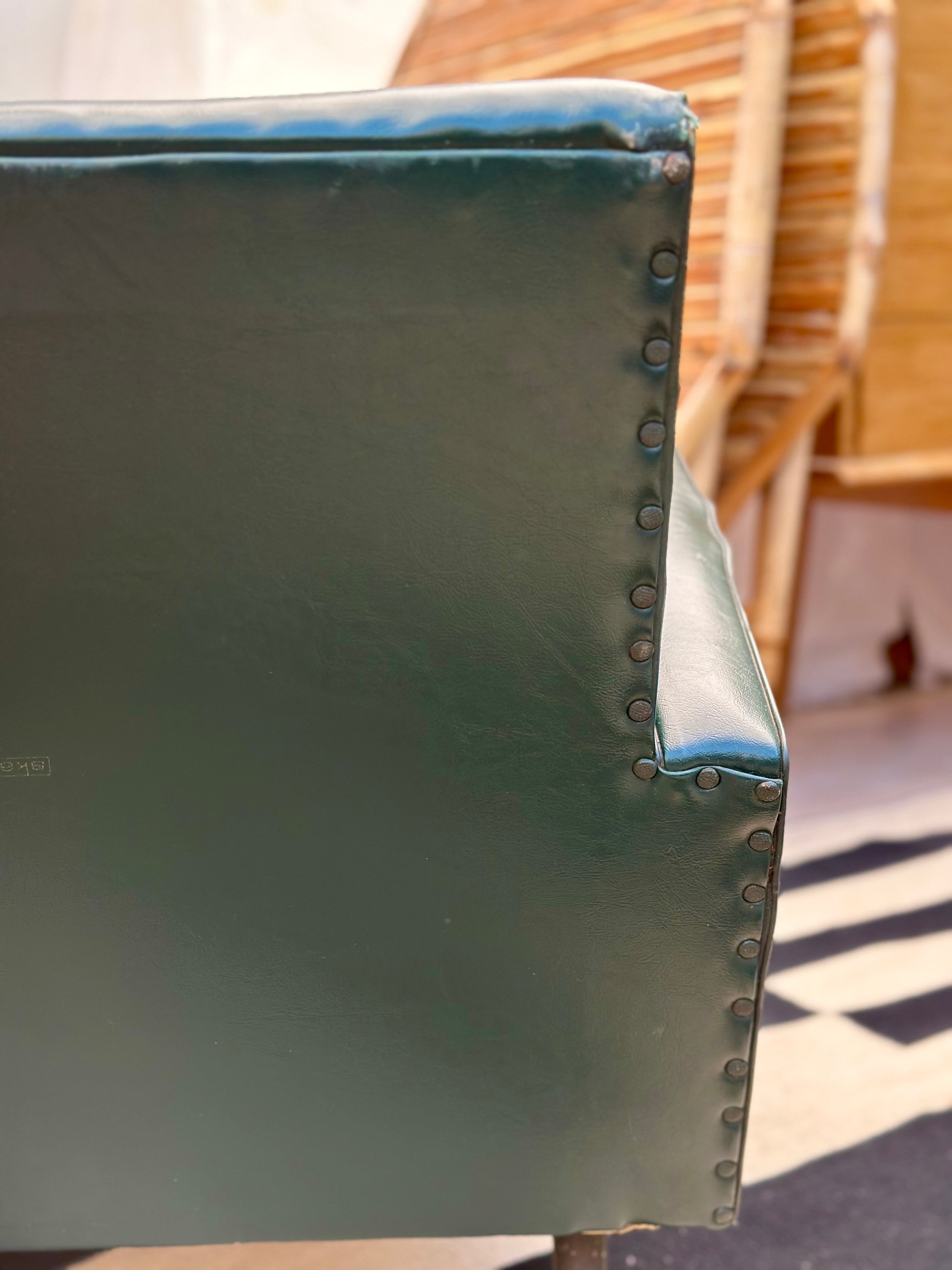 Comment ne pas tomber amoureux(se) du charme yéyé de ce canapé deux places en véritable Skaï vert bouteille des années 60 ?
