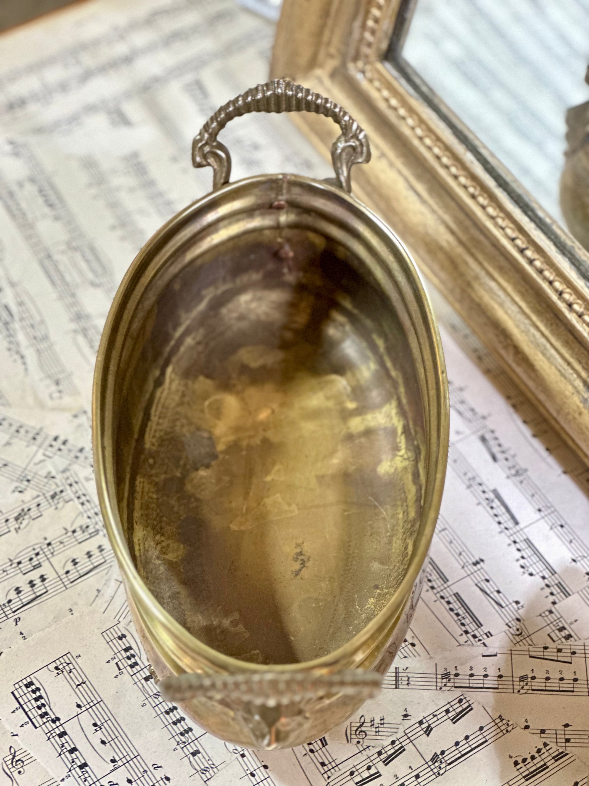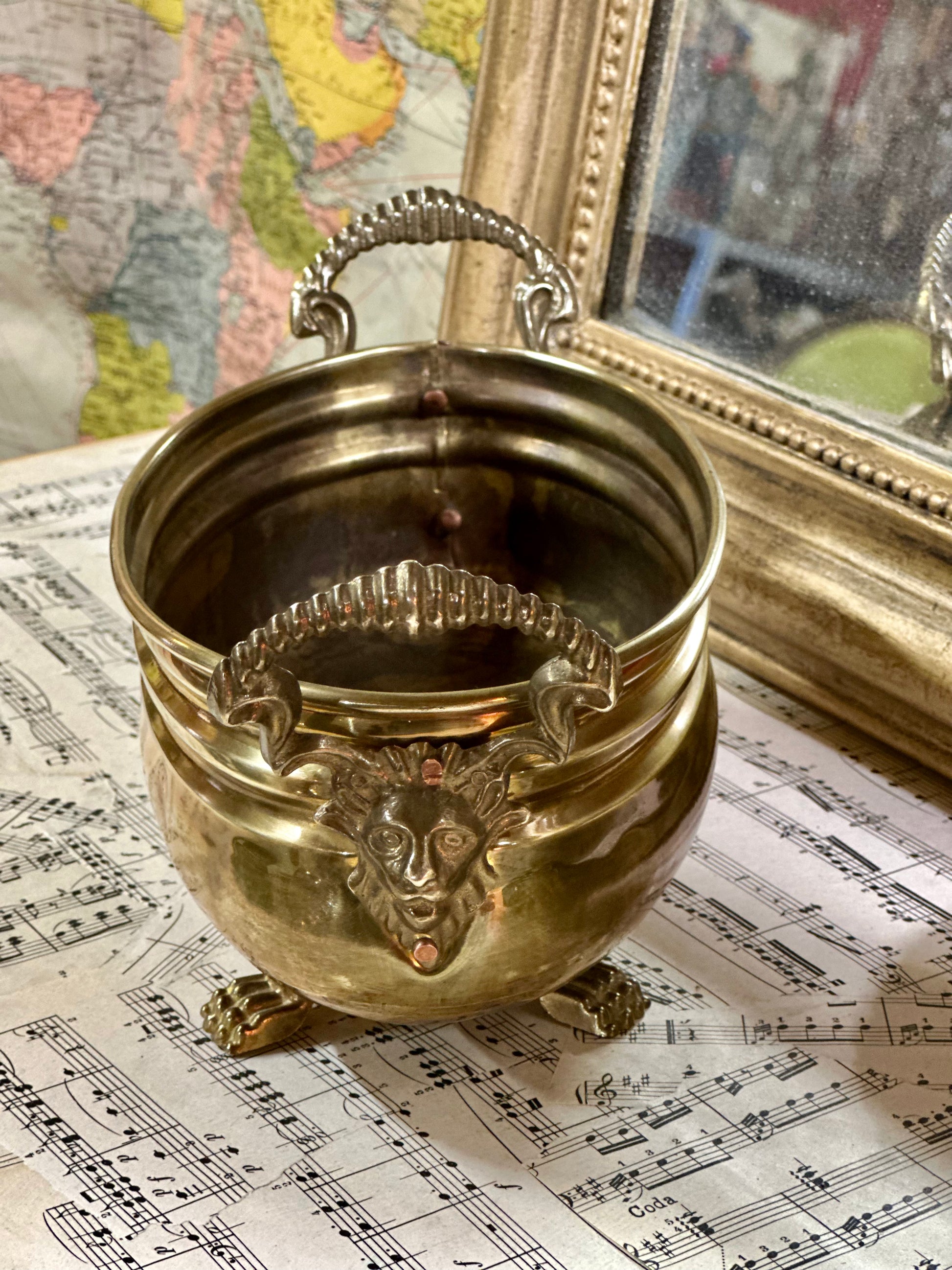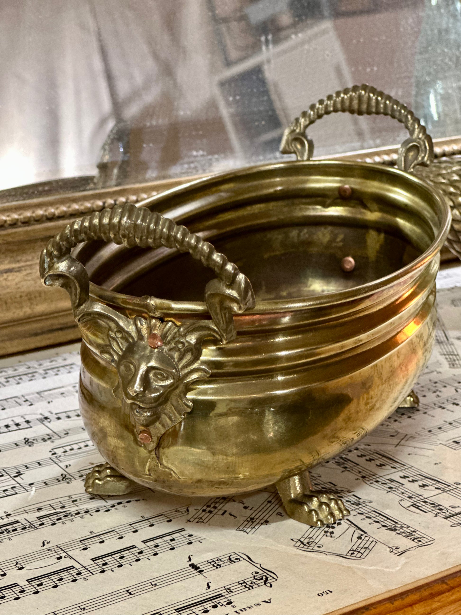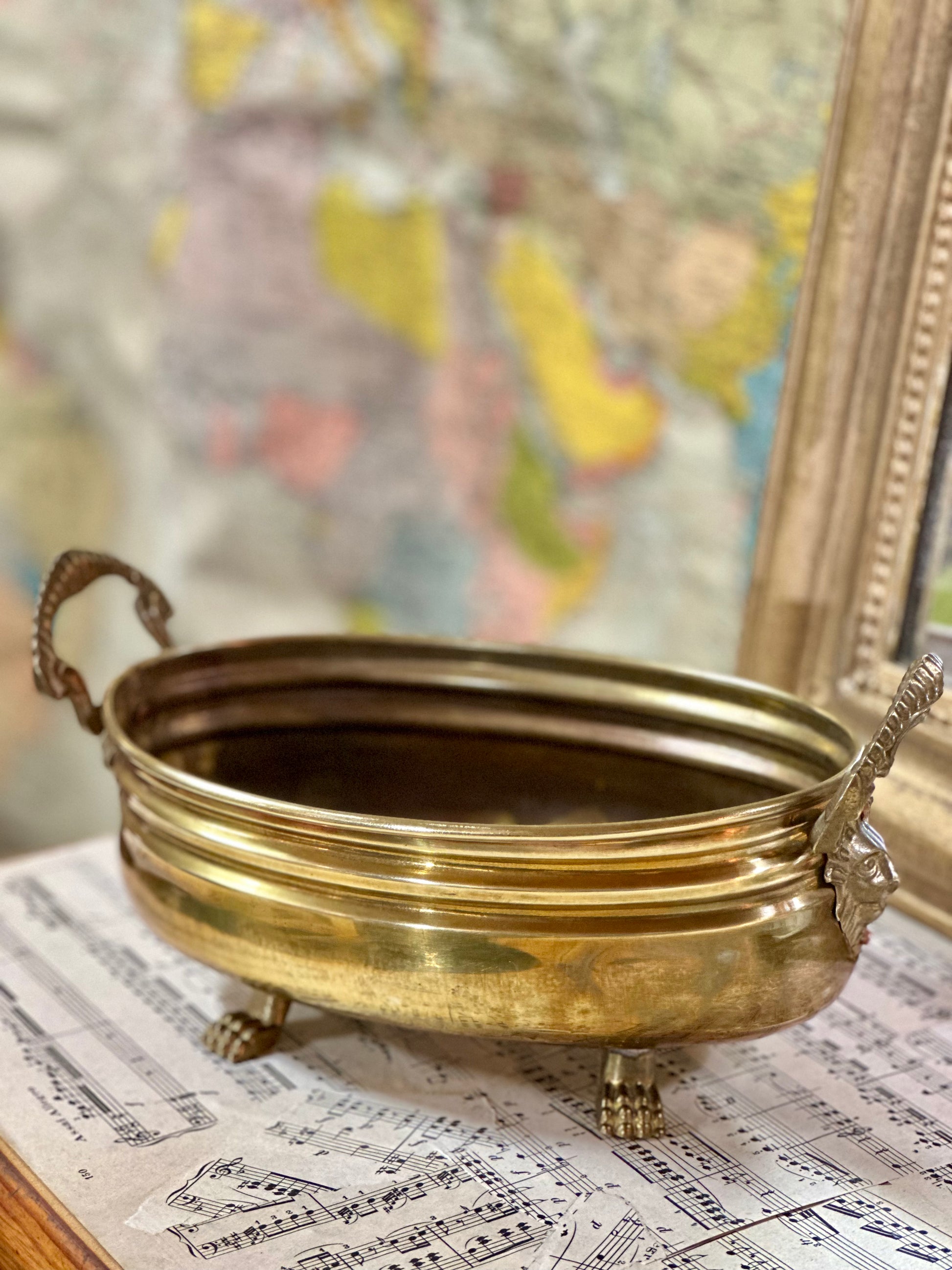 En centre de table, pour y mettre des fleurs ou simplement en décoration seule ou en accumulation, cette ravissante jardinière en cuivre jaune sur ses pattes de lion est d'une élégance folle.