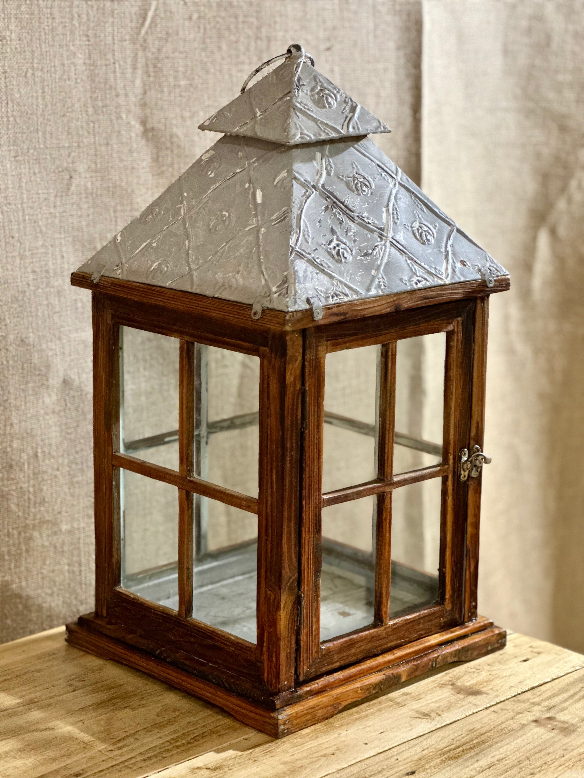 Lanterne en bois et toit de zinc pour y poser une bougie ou autre objets de décoration.