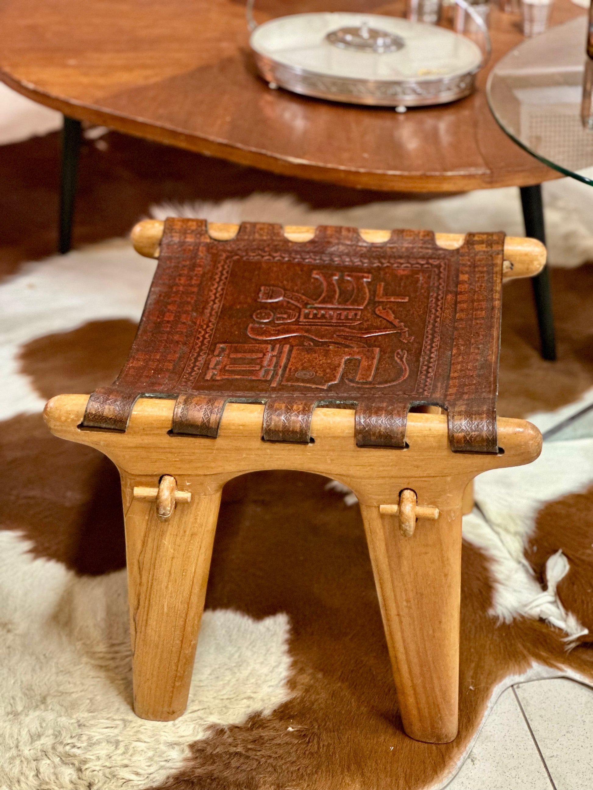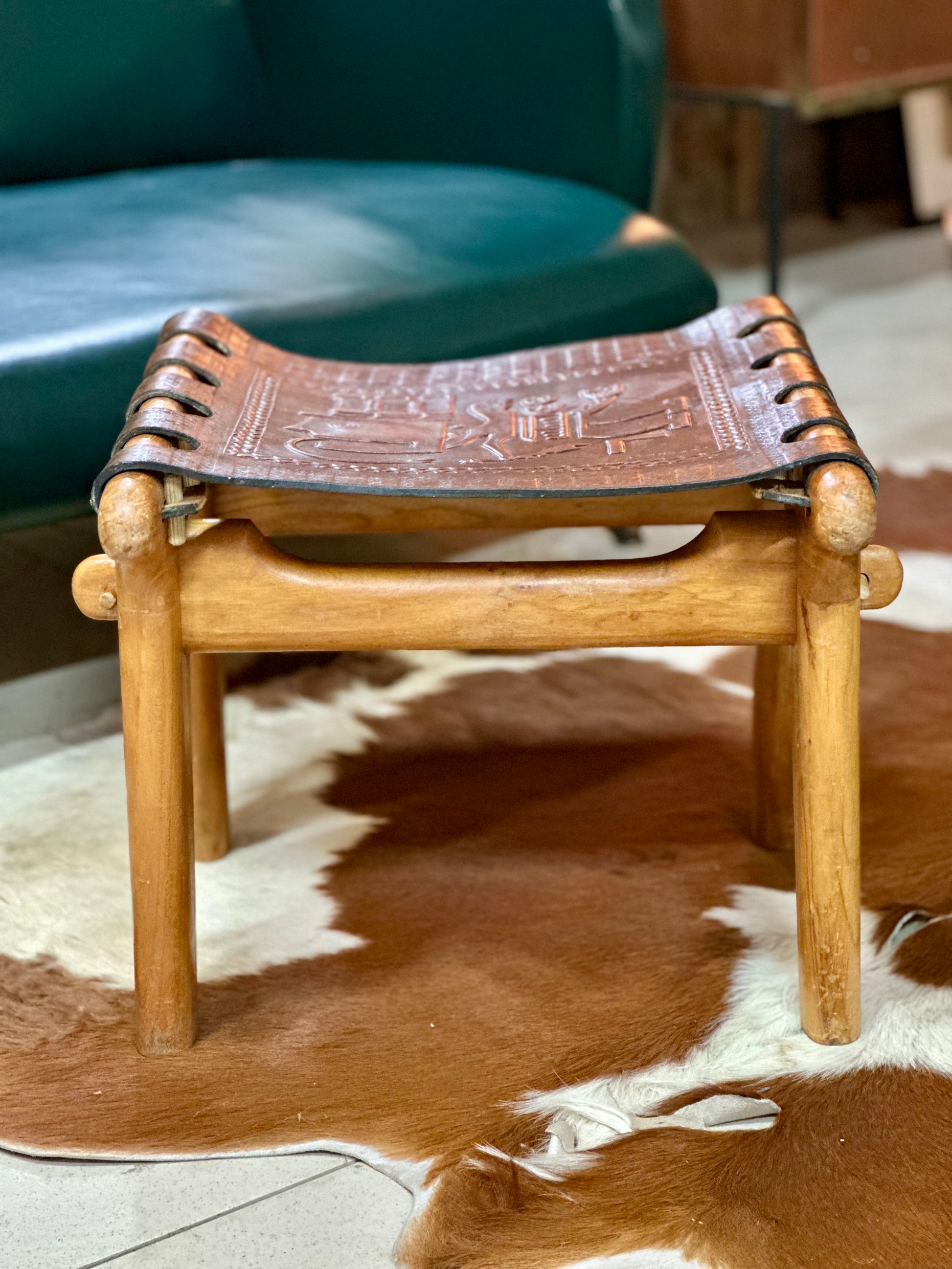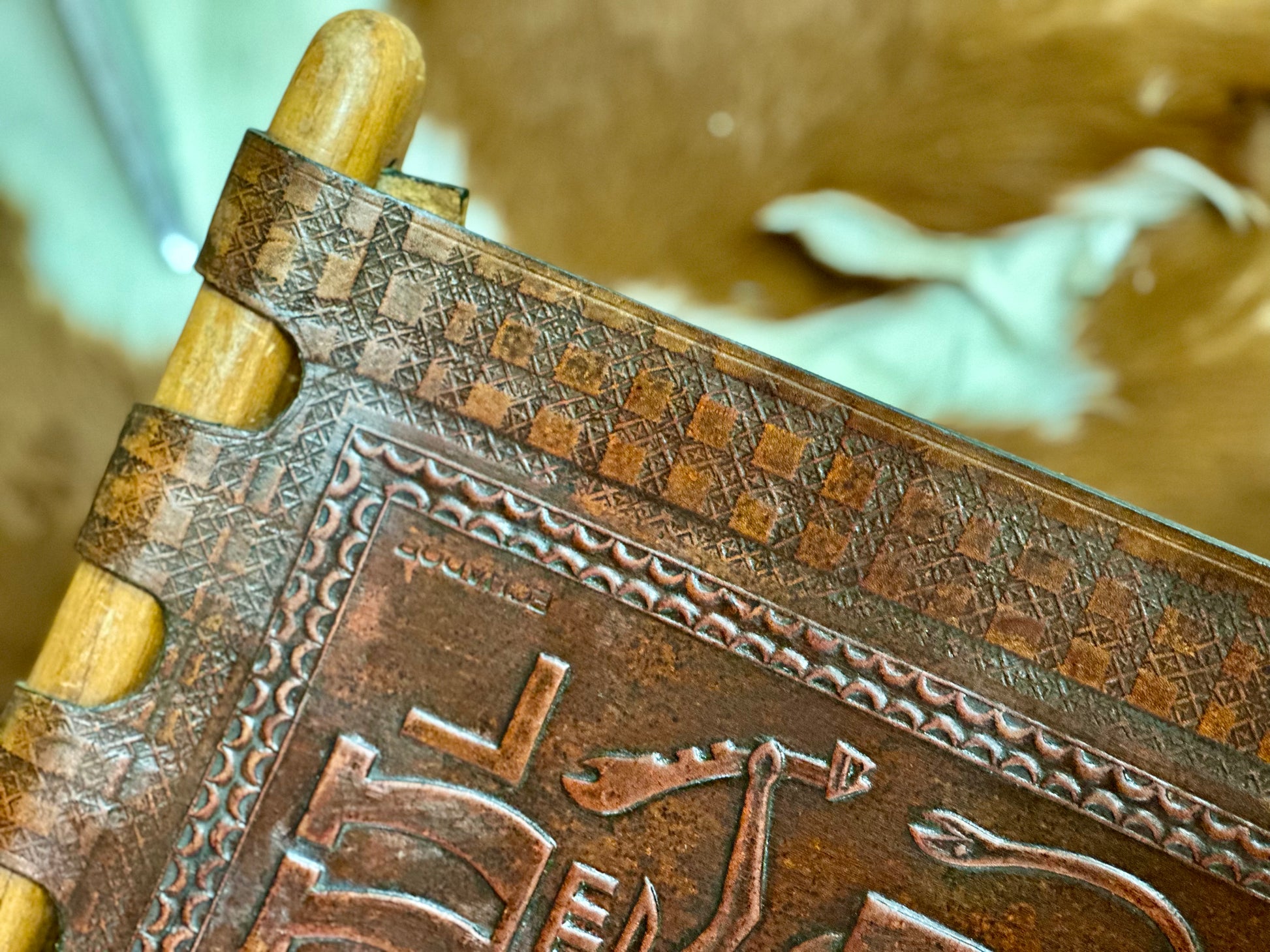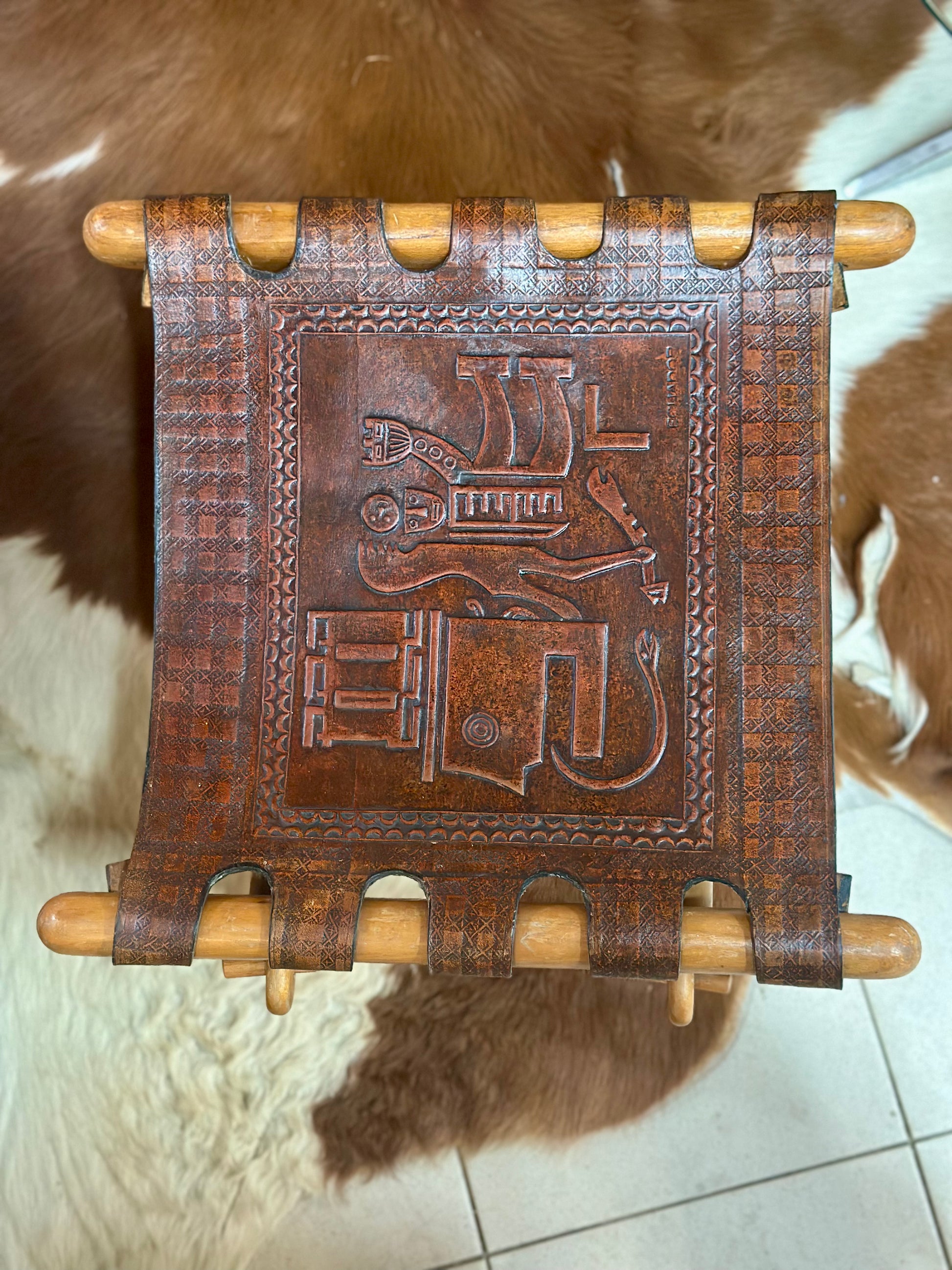 Bois de laurier. Assemblage des éléments grâce un ingénieux système d'emboîtement, sans vis, à clavettes. Assise en cuir épais aux motifs emboutis précolombiens.