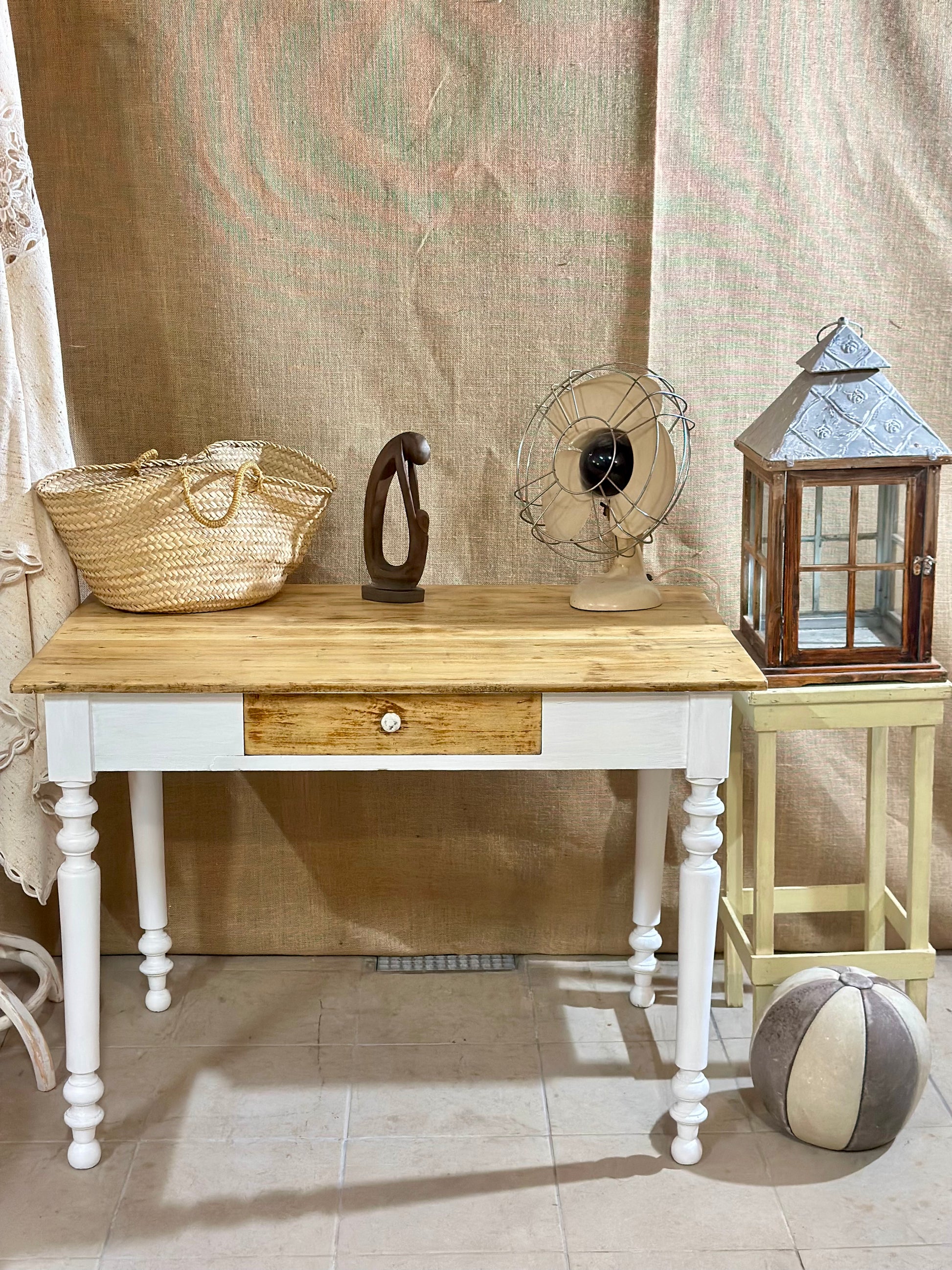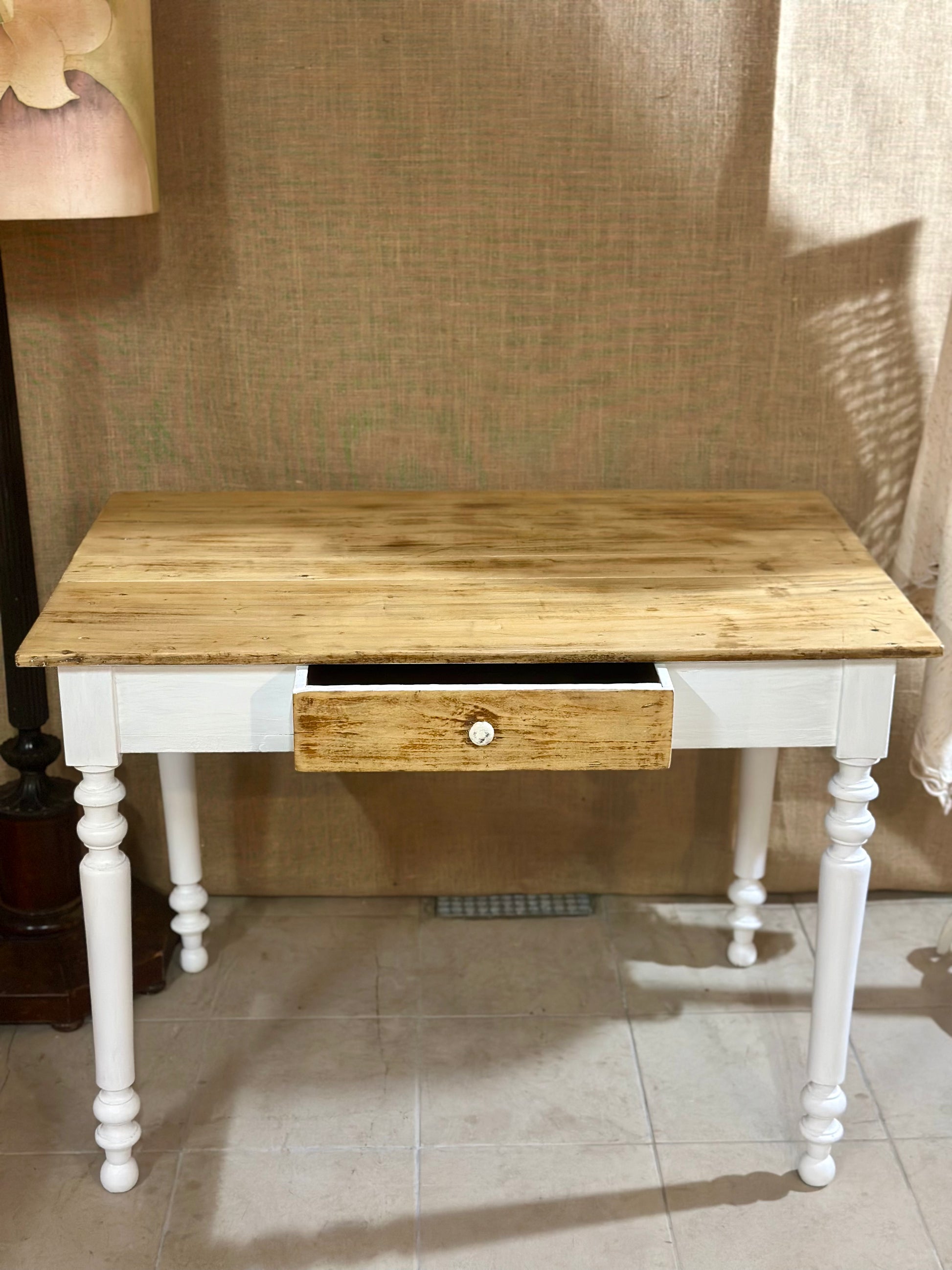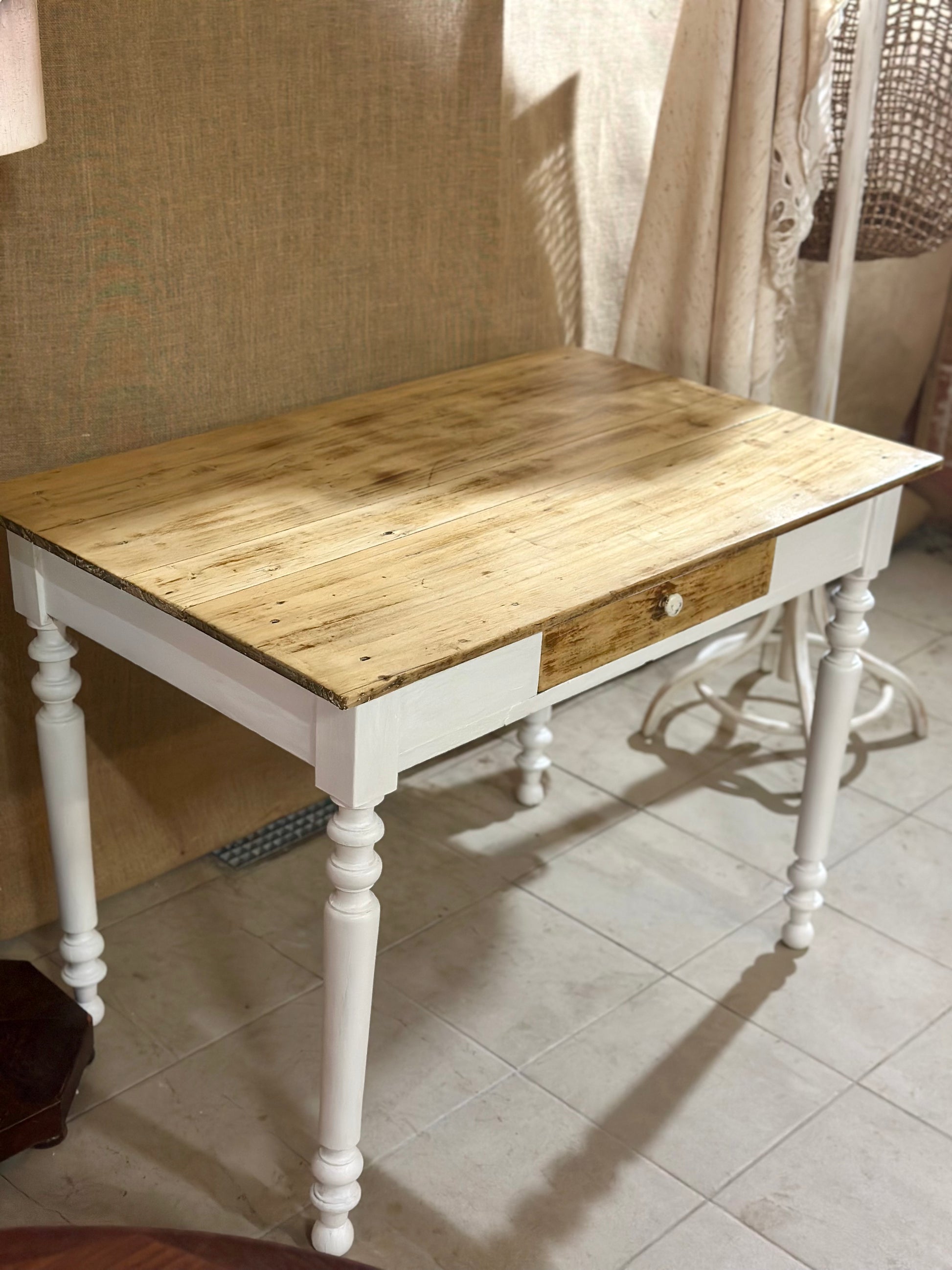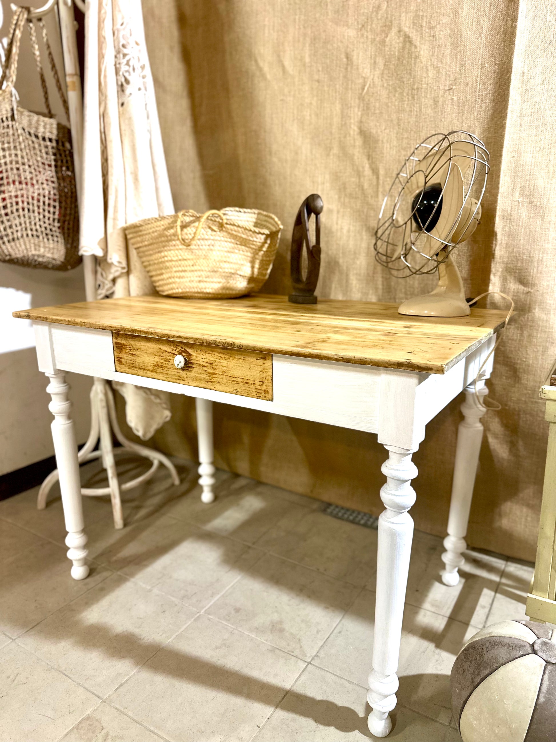 Elle est toute en douceur cette jolie table de campagne avec son piètement repeint en blanc mat et son plateau remis à nu et vernis.